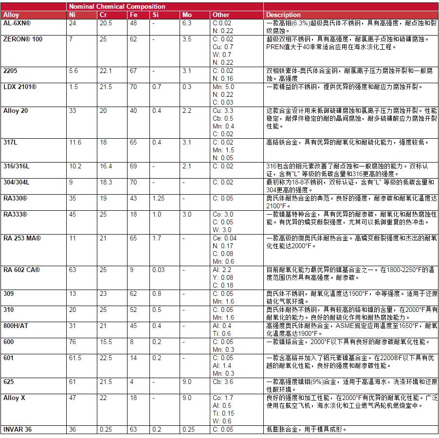 | 環境控制 | 我們提供的許多合金可以運用于污染控制系統,諸如煙氣脫硫單元FGD,濕法靜電除塵WESP和碳吸收器。在高氯標準,酸性PH值和上升溫度組成的腐蝕環境中,擁有鉬元素的合金可以有效抵御點蝕和裂紋腐蝕。. AL-6XN, ZERON 100和2205在許多FGD和WESP領域中,用來制造吸收容器, 墻壁,輸氣管道,導向裝置,泵,紙漿處理系統,葉輪和節氣閥。AL-6XN在很多FGD系統領域服務了20多年沒有任何質量問題。雙相鋼2205和ZERON 100的高強度和相對高鎳合金更經濟的成本,使得它們的運用變得越來越廣。2205雙相鋼也可以用作飛機制造廠的碳吸收和封存容器 |